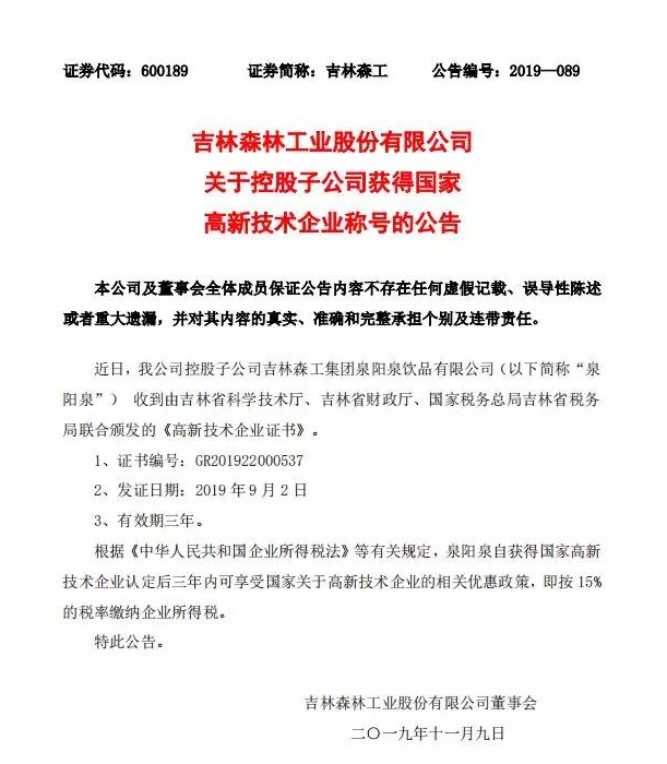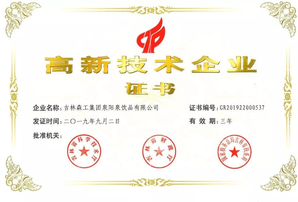 ? ? ? 根據(jù)科學(xué)技術(shù)廳、吉林省財政廳、國家稅務(wù)總局聯(lián)合頒布的《關(guān)于公布吉林省2019年第一批國家高新技術(shù)企業(yè)認定結(jié)果的通知》,經(jīng)過層層審核,吉林森工集團泉陽泉飲品有限公司由吉林省科學(xué)技術(shù)廳、吉林省財政廳、北京市國家稅務(wù)局、國家稅務(wù)總局吉林省稅務(wù)局局聯(lián)合批準(zhǔn)下發(fā)的高新技術(shù)企業(yè)認定。